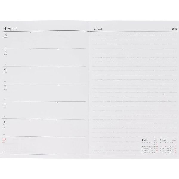 【3月始まり/192ページ】 ◎カバー付きサイズ/H186xW128xD12mm ◎重さ/約194g ◎カバー仕様/取り外し可能・塩ビ製カバー・カードスリット・ペンホルダー付 ◎専用ステッカー付き ◎スピン/2本1週間のおおまかな予定を把握しつつ 週単位でTO DOやメモを書ける週間レフト 予定とメモのバランスがちょうどいい、ウィークリーページ 1日の予定が少ない、または予定管理はデジタル中心で自己管理用におおまかな予定を記入して、手帳は週単位のタスク管理やメモ用に使いたい、そんな人におすすめなのが週間レフトタイプ。