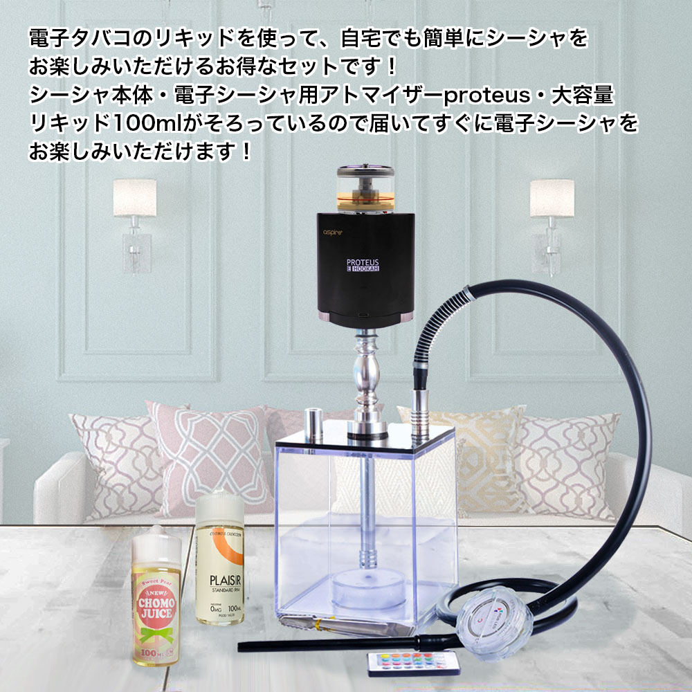 商品説明 シーシャをもっと手軽に! 電子タバコのリキッドを使って、自宅でも簡単にシーシャをお楽しみいただけるお得なセットです! シーシャ本体・電子シーシャ用アトマイザーproteus・大容量リキッド100mlがそろっているので 届いてすぐに電子シーシャをお楽しみいただけます! シーシャ本体は、LEDユニットを使用することで煌びやかなカラーに発光! リモコン操作でお好みのカラーをお選びいただけます。